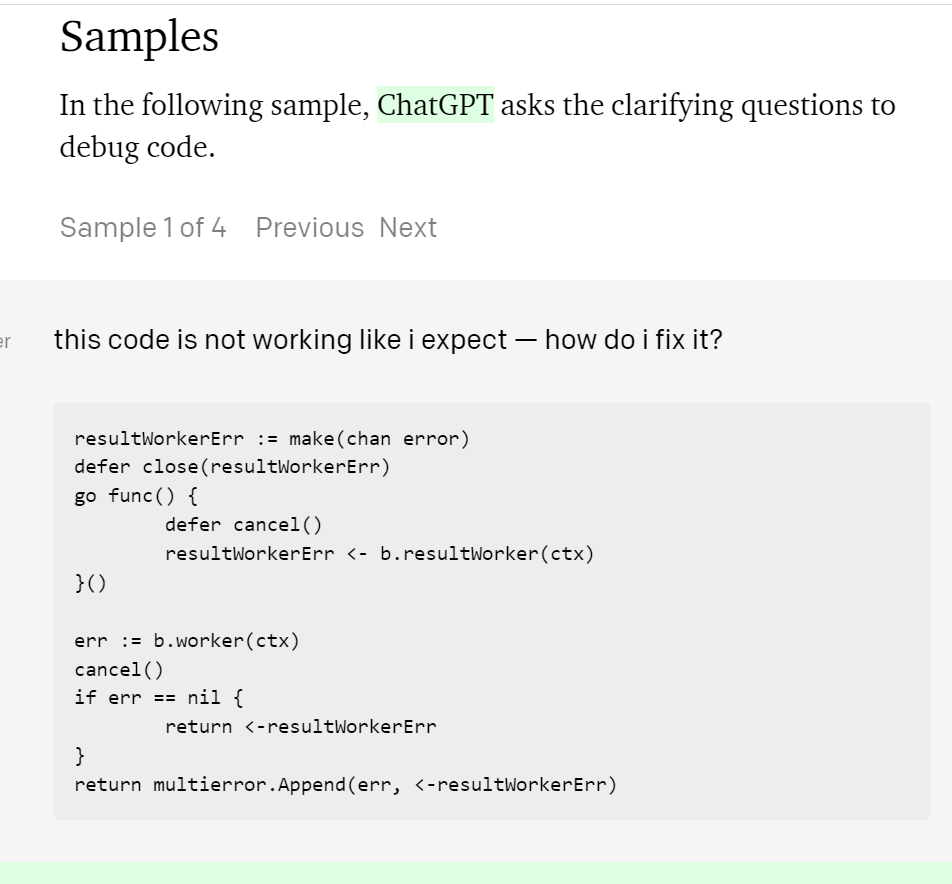OpenAI’s website shows an example of utilising ChatGPT to debug code. To generate responses, prior code is needed as the AI lacks the capability to imitate human based QA. Directly programming with ChatGPT is not without its risks of errors and bugs. OpenAI even acknowledged that ChatGPT can sometimes write “plausible-sounding but incorrect or nonsensical answers.”